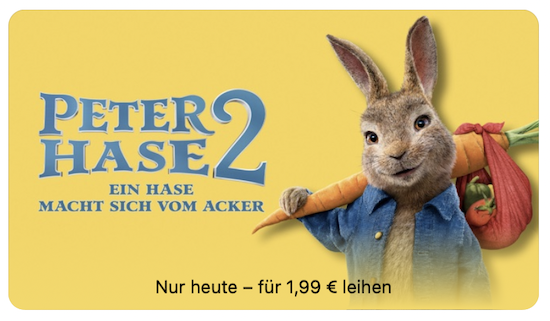 Auch heute hat Apple wieder den sogenannten "Movie Mittwoch" ausgerufen. Dabei wird jeden Mittwoch ein ausgewählter Film aus dem iTunes-Sortiment für 24 Stunden zum Sonderpreis von nur € 1,99 in HD-Qualität zum Leihen angeboten. In dieser Woche handelt es sich dabei um den Familienfilm Peter Hase 2 - Ein Hase macht sich vom Acker, den man zum Sonderpreis von € 1,99 erhält. Nachdem man den Leih-Film geladen hat, kann er innerhalb von 30 Tagen angeschaut werden. Wie immer bei geliehenen Filmen aus dem iTunes Store gilt: Hat man hiermit einmal begonnen, muss man ihn innerhalb von 48 Stunden beenden.