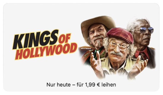 Auch heute hat Apple wieder den sogenannten "Movie Mittwoch" ausgerufen. Dabei wird jeden Mittwoch ein ausgewählter Film aus dem iTunes-Sortiment für 24 Stunden zum Sonderpreis von nur € 1,99 in HD-Qualität zum Leihen angeboten. In dieser Woche handelt es sich dabei um die Komödie Kings of Hollywood, die man zum Sonderpreis von € 1,99 erhält. Nachdem man den Leih-Film geladen hat, kann er innerhalb von 30 Tagen angeschaut werden. Wie immer bei geliehenen Filmen aus dem iTunes Store gilt: Hat man hiermit einmal begonnen, muss man ihn innerhalb von 48 Stunden beenden.