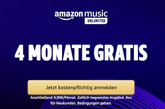 Der Online-Händler Amazon verkauft schon lange nicht mehr nur Bücher, Elektronik, Kleidung und allerlei sonstige Produkte, sondern ist auch im Bereich der digitalen Dienste höchst aktiv. Größerer Beliebtheit erfreut sich vor allem das Musikstreaming-Angebot von Amazon mit dem Namen Amazon Music Unlimited. Dieses wird aktuell mal wieder in einem äußerst attraktiven Deal angeboten, vorausgesetzt, man hat den Dienst bislang nich nicht genutzt. Ist dies gegeben, erhält man aktuell vier Monate Zugriff auf Amazon Music Unlimited für umme. Das Angebot kann jederzeit gekündigt werden. Möchte man den Dienst anschließend weiternutzen, werden hierfür für Prime-Abonnenten monatlich € 7,99 bzw. für alle anderen € 9,99 fällig. Das Angebot kann über den folgenden Link gebucht werden: Amazon Music Unlimited 4 Monate kostenlos