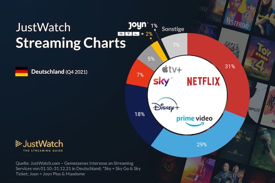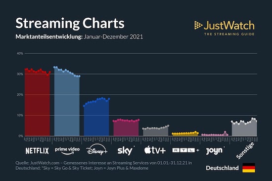In ihrem Rückblick auf das Jahr 2021 weisen die Kollegen von JustWatch Disney+ als den größten Gewinner auf dem Streamingmarkt aus. Um 3% konnte der Streamingdienst im Laufe des Jahres zulegen. Apple TV+ wuchs im Jahr 2021 um 2%, während vor allem Amazon Prime Video mit einem Verlust von 4% den stärksten Rückgang hinnehmen musste und von Netflix an der Spitze abgelöst wurde.