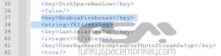 - den folgenden Code in die Datei einfügen: <key>EnableFirebreak</key><string>YES</string>