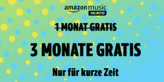 Der Online-Händler Amazon verkauft schon lange nicht mehr nur Bücher, Elektronik, Kleidung und allerlei sonstige Produkte, sondern ist auch im Bereich der digitalen Dienste höchst aktiv. Größerer Beliebtheit erfreut sich vor allem das Musikstreaming-Angebot von Amazon mit dem Namen Amazon Music Unlimited. Dieses wird aktuell mal wieder in einem äußerst attraktiven Deal angeboten, vorausgesetzt, man hat den Dienst bislang nich nicht genutzt. Ist dies gegeben, erhält man aktuell drei Monate Zugriff auf Amazon Music Unlimited für umme. Das Angebot kann jederzeit gekündigt werden. Möchte man den Dienst anschließend weiternutzen, werden hierfür für Prime-Abonnenten monatlich € 7,99 bzw. für alle anderen € 9,99 fällig. Das Angebot kann über den folgenden Link gebucht werden: Amazon Music Unlimited 3 Monate kostenlos