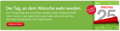 An jenem Freitag steht übrigens in den USA der traditionelle Black Friday auf dem Programm. Hierbei handelt es sich um den Tag nach Thanksgiving, der als Brückentag in den USA das Weihnachtsgeschäft einläutet. In den vergangenen Jahren hat Apple zu diesem Anlass diverse Produkte in seinem Online Store für diesen einen Tag reduziert. Dies gilt seit einiger Zeit nicht nur für die USA, sondern international, so dass auch in diesem Jahr wieder einige Schnäppchen zu erwarten sind. Ich werde selbstverständlich entsprechend berichten.