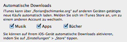 Eine weitere hiermit einhergehende Funktion ist der automatische Download von Musik aus dem iTunes Store. Soll heißen, wenn man beispielsweise am heimischen Mac einen Musiktitel lädt, wird dieser auch automatisch und ohne weiteres Zutun auf allen anderen entsprechend konfigurierten Geräten heruntergeladen. Allerdings müssen sowohl iTunes, als auch die iOS-Geräte hierfür zunächst freigeschaltet werden. Auf den iOS-Geräten geschieht dies in den Einstellungen, in der Sektion "Store".