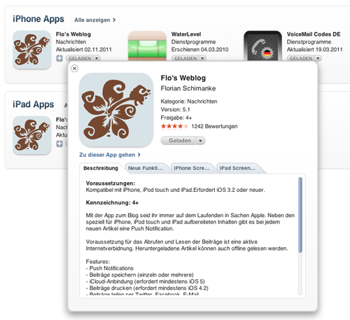 Bereits Mitte Dezember tauchten im in iTunes am Rechner integrierten AppStore vereinzelt die bereits aus dem Musik-Store bekannten Quick-Info Fenster auf. Inzwischen hat Apple diese Funktion offenbar flächendeckend eingeführt. Bewegt man die Maus über das Icon einer App, erscheint in der rechten unteren Ecke ein kleines i (siehe erster Screenshot), welches nach einem Klick auf selbiges ein Overlay-Fenster öffnet (zweiter Screenshot). Hierin enthalten sind kompakt zusammengefasst und auf verschiedene Tabs verteilt, dieselben Inhalte, die auch auf der vollständigen Infoseite der jeweiligen App enthalten sind, inkl. Beschreibung, Update-Inhalte, Bewertungen und Screenshots. Auf diese Weise wird es künftig überflüssig, etwa bei einer Suche sich bis auf die jeweilige Seite der App vor zu klicken. Stattdessen hat man nun sämtliche Informationen im Schnellzugriff. Neben Apps haben übrigens auch Filme, TV-Serien, Bücher und Podcasts diese Funktion erhalten.