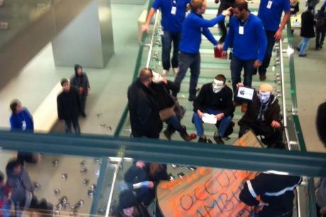 Unternehmen gehandelt habe, die sich angekettet und Flugblätter von der oberen Etage des Stores geworfen haben. Grund für die Aktion sollen aktuelle Berichte über die Arbeitsbedingungen beim Apple-Zulieferer Foxconn sein, wo es in der Vergangenheit aus diesem Grund schon diverse Selbstmorde gegeben hat. Die Aktivisten trugen Anonymous-Masken und forderten mehr Fairness bei der Produktion der Apple-Produkte bei Foxconn. Die gerufene Polizei räumte daraufhin das Geschäft und nahmen die Personalien der Aktivisten auf. Der Store blieb für den Rest des Tages geschlossen, wird aber vermutlich am Montag wieder wie gewohnt öffnen.
