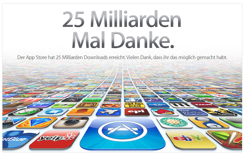 Vor ziemlich genau zwei Wochen hatte Apple den Countdown zu 25 Milliarden Downloads aus dem [iOS] AppStore gestartet. In der vergangenen Nacht wurde diese Marke nun erreicht. Seither erstrahlen die Apple Webseiten weltweit auf ihrer Startseite mit der unten angehängten Danksagung. Zum Vergleich: Ein Jahr nach dem Start des AppStore im Jahr 2008 waren bereits 1,5 Milliarden