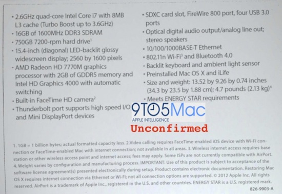 Ein wenig plausibler erscheinen da schon die Details, die auf einem Foto zu sehen sind, das die Kollegen von 9to5Mac erhalten haben. Dieses geht nämlich in eine komplett andere Richtung und lässt eher vermuten, dass Apple das MacBook Pro zu einer wahren Power-Wumme und dabei wie erwartet deutlich dünner und leichter macht. So soll das Gerät angeblich künftig knappe 1,9 cm dick sein (aktuell sind es ca. 2,5 cm) und ein Gewicht von gut 2,1 kg (aktuell gute 2,5 kg) haben. Mit an Board sollen wie bereits vermutet neben den neuen Ivy Bridge Prozessoren mit Intel HD Graphics 4000 und dedizierten AMD Grafik-Chips auch ein Retina Display mit einer Auflösung von 2560×1600 Pixeln im 16:10-Format sein. Hinzu kommen USB 3, HD FaceTime Kamera, Thunderbolt-Anschluss, Bluetooth 4.0, SDXC Karten-Slot, FireWire und ein Ethernet-Port. Diverse Details widersprechen allerdings auch bisherigen Gerüchte, weswegen auch dieses Bild mit einer gehörigen Portion Skepsis zu sehen ist.