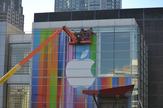 Inzwischen hat Apple auch mit den Vorbereitunden des Events am Yerba Buena Center for the Arts in San Francisco begonnen. Eine passende Galerie dazu liefern die Kollegen von 9to5Mac. Vor einem bunten Hintergrund präsentiert sich dort das Apple-Logo. Ein Hintergrund, der evtl. auch auf verschiedene erhältliche Farbkonfigurationen bei den neuen iPods hinweisen könnte.