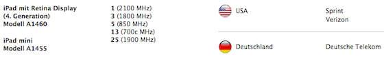 Bei den Speicherkonfigurationen orientiert sich Apple am großen Bruder, bietet das Gerät also mit 16, 32 und 64 GB und in den Farben schwarz und weiß an. Zudem gibt es auch hier eine WiFi-only und eine WiFi+LTE Variante. Preislich haben sich meine Informationen aus dem Media Markt Warenwirtschaftssystem nicht ganz bestätigt, lagen aber auch nicht so weit daneben. Das Low-End Modell mit 16 GB Speicher und WiFi-only kommt für € 329,- in den Handel für jeweils € 100,- mehr bekommt man die größeren Ausbaustufen. Mit weiteren € 130,- mehr erhält das iPad mini auch LTE-Konnektivität. Alle Modelle können hierzulande (und auch in Österreich, Luxemburg und der Schweiz) ab kommenden Freitag, den 26. Oktober im Apple Store vorbestellt werden. Das WiFi-only Modell kommt dann am 02. November in den Handel (bzw. mit der Post), das LTE-Modell laut Apples Pressemitteilung "ein paar Wochen nach den Wi-Fi-Modellen". A propos LTE... Apple hat inzwischen klargestellt, dass das iPad mini auch in Deutschland im LTE-Netz der Telekom funken kann.