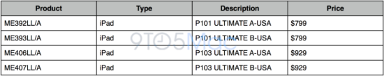 Eine weitere Variante bringen die Kollegen von 9to5Mac ins Spiel, die von ihren Apple-Quellen in Erfahrung gebracht haben, dass es eher und vor allem schon in naher Zukunft (evtl. zusammen oder im zeitlichen Zusammenhang mit der finalen Version von iOS 6.1?) eine weitere Konfigurationsgröße des aktuellen Retina iPads der vierten Generation geben soll, welches dann mit 128 GB Speicherkapazität käme. Dieses soll sich dann zu den bereits erhältlichen 16 GB, 32 GB und 64 GB Varianten gesellen. Die in der unten zu sehenden Tabelle aufgeführten Bezeichnungen P101 und P103 stehen für Apples interne Namen der WiFi-only und Cellular-Modelle des iPad 4, während "A" für die schwarze Farbvariante steht, "B" für die weiße. Die drei bisher vorhandenen Speicherkonfigurationen bezeichnet Apple intern als "Good" (16 GB), "Better" (32 GB), "Best" (63 GB). "Ultimate" ist da durchaus eine denkbare Variante für die 128er Version. (mit Dank an Bernd!)