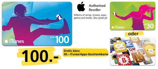 In Deutschland ist es aktuell der Elektronik-Fachhändler Expert, der die iTunes Geschenk-Karten zum vergünstigten Preis anbietet. Doch auch für meine Leser in der Schweiz gibt es zur Zeit wieder eine Aktion mit vergünstigten iTunes-Karten. Dort ist es mal wieder die Post, die aktuell zu jeder gekauften Karte mit einem Guthaben von CHF 100,- eine weitere Karte im Wert von CHF 30,- gratis dazu gibt. Pro Kunde kann nur eine Karte gekauft werden und die Aktion ist auf 6000 Kartensets limitiert. Man sollte also im Zweifel schnell sein, um noch rechtzeitig zuschlagen zu können. Schließlich haben die Karten ja kein Verfallsdatum. Der Wert der Karte kann sowohl für Musik, als auch für Fernsehserien, Filme und Einkäufe im Mac- und iOS-AppStore genutzt werden. (mit Dank an Christof!)