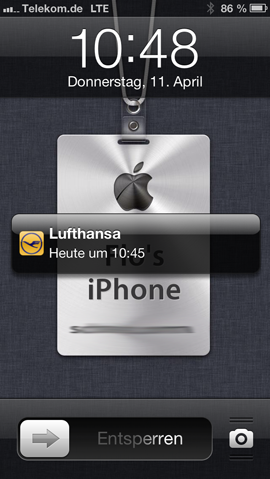Die Anzahl der Passbook nutzenden Angebote im Alltag ist nach meiner persönlichen Wahrnehmung auch ein gutes halbes Jahr nach dem Start noch extrem überschaubar. Nehme ich mal meine ganz persönliche Nutzung von Passbook als Maßstab, kann ich in den vergangenen sieben Monaten genau ein einziges Mal zählen, bei dem ich es tatsächlich genutzt habe. Und zwar am vergangenen Donnerstag bei einem Flug mit der Lufthansa von Hannover nach München und zurück. Die Erfahrung die ich dabei gemacht habe, ist jedoch absolut erwähnenswert und zeigt das Potenzial von Passbook. Nach dem Check-in über die Lufthansa-App am Vortag des Fluges wurde mir die Ablage des digitalen Tickets in Passbook inkl. Sperrbildschirm-Integration angeboten, die ich dankend annham. Pünktlich am Flugtag tauchte der Pass dann auch in eben jenem Sperrbildschirm auf, zeigte mir die korrekte Boarding-Zeit an und blieb dort auch bis ich in München angekommen war. Wischt man das Icon (in diesem Fall das der Lufthansa-App) nach rechts, öffnete sich ohne Umwege das Ticket. Schloss man es wieder, kehrte man direkt in den Sperrbildschirm zurück. Sehr komfortabel, sehr intuitiv, sehr einfach. Beim Boarding also einfach den Pass aus dem Sperrbildschirm heraus geöffnet, auf den Scanner gelegt und ins Flugzeug gestiegen. Genau diese kleinen Alltags-Annehmlichkeiten sind es, die Apple mit dem Passbook realisieren will. Gelungen? Check.