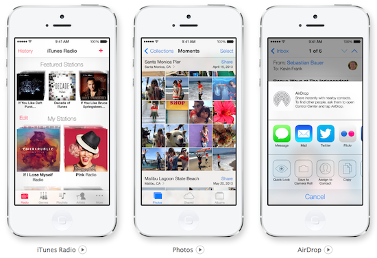 Und auch die Musik-App hat einen neuen Look und eine neue Funktion erhalten. Auch unter iOS verabschiedet sich Apple nun von Cover Flow und präsentiert die Alben-Cover nun stattdessen über- und nebeneinander angeordnet. Neu und in die App integriert ist Apples neuer Musikstreaming-Dienst unter dem Namen "iTunes Radio". Neben iOS funktioniert dieses auch in iTunes und über Apple TV. iTunes Radio wird durch Werbung unterstützt und ist kostenlos. Für iTunes Match Kunden wird es komplett werbefrei sein. Allerdings gibt es iTunes Radio zunächst ausschließlich in den USA. Weitere Länder sollen folgen.