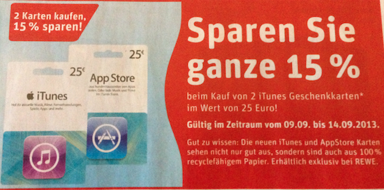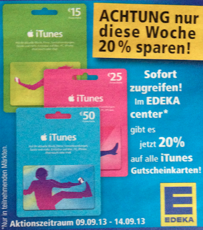 UPDATE: Auch bei Marktkauf gibt es diese Woche offenbar iTunes Karten mit einem Rabatt von € 20,-. (mit Dank an Astrid!)