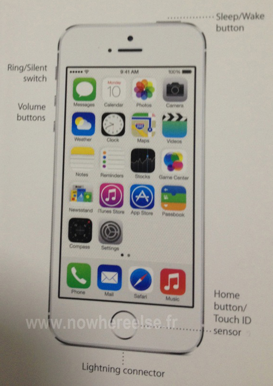 Nur noch wenige Augenblicke sind es bis zu Apples heutigen Special Event unter dem Motto "This should brighten up everyone's day." auf dem mit an Sicherheit grenzender Wahrscheinlichkeit neue iPhones präsentiert werden. Die in den vergangenen Tagen aufgekommenen Gerüchte können noch einmal kompakt in meinem iPhone-Event Gerüchte-Roundup nachgelesen werden. Aber auch kurz vor dem Event schießen weiter kräftig Gerüchte aus dem Boden. So haben die französischen Kollegen von nowhereelse ein Foto veröffentlicht, auf dem angeblich der Beipackzettel des iPhone 5S zu sehen sein soll. Darauf zu sehen ist die Beschriftung "Home button / Touch ID sensor", was, die Authentizität des Bildes vorausgesetzt, dann wohl die letzte Bestätigung für den erwarteten Fingerabdruckssensor im iPhone 5S sein dürfte.