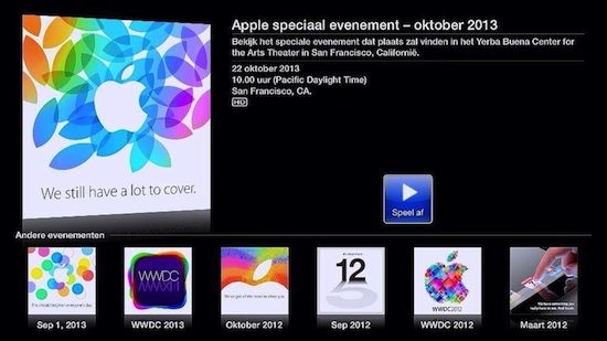 Live-Stream ins Internet senden. Der entsprechende "Kanal" ist bereits auf dem Homescreen des Apple TV aufgetaucht (via MacRumors) und der Stream wird auch über die Apple Event-Webseiten am Rechner verfügbar sein. Als Systemvoraussetzungen gibt Apple wie auch schon in den vergangenen Jahren an: "Safari 4 or later on Mac OS X v10.6 or later; Safari on iOS 4.2 or