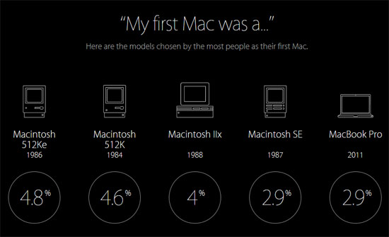 Zudem hat man hier auch die Möglichkeit, die Erinnerungen an den ersten eigenen Mac mit anderen zu teilen. Die Ergebnisse hieraus lassen sich in Echtzeit auf der Webseite bewundern. Aktuell ist tatsächlich der 1986er Mac das Modell, welches von den meisten Teilnehmern als ihr erster Mac genannt wurde. Bei mir war es übrigens ein 2007er MacBook, welches ich jedoch schon ein paar Wochen später gegen ein MacBook Pro desselben Jahrgangs eintauschte. Interessant ist auch, wie sich das Nutzungsverhalten auf dem Mac seit 1984 verändert hat. War seinerzeit noch "Education/Teaching" die meistgegebene Antwort, sind es heute "Internet & E-Mail".