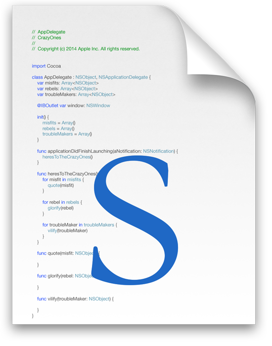 Während immer wieder über die Detailverliebtheit bei Apple gesprochen wird, finde ich es mindestens ebenso spannend, wie akribisch die Apple-Gemeinde nach jedem noch so kleinen Detail Ausschau hält. Beides zusammen genommen führt dann immer wieder zu einem kleinen Lächeln, das einem über das Gesicht huscht, wenn mal wieder etwas entdeckt wurde. Aktuelles Beispiel: Apples neue Programmiersprache Swift. Hiermit wurde natürlich auch eine neue Dateiendung eingeführt, die ebenfalls .swift lautet, sowie ein Symbol für ebensolche Dateien. Und genau hierauf hat ein Twitter-User (via 9to5Mac) eine interessante Entdeckung gemacht. Der bei genauem Hinsehen darauf zu erkennende Quelltext referenziert nämlich den berühmten Text aus Apples "Think Different." Kampagne, "Here's to the crazy ones". So findet man unter anderem Funktionen mit den Namen "heresToTheCrazyOnes" und "villify(troubleMaker: