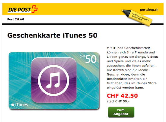 Die Woche endet dieses Mal mit guten Nachrichten für alle Schnäppchenjäger in der Schweiz: Es gibt wieder vergünstigte iTunes-Geschenkkarten. Dieses Mal ist es die Schweizerische Post, die die Karten online um Sonderpreis verkauft. Hier zahlt man aktuell auf jede erworbene iTunes-Geschenkkarte im Wert von CHF 50,- lediglich CHF 42,50. Wie lange die Aktion angeboten wird, ist leider nicht ersichtlich. Die Karten haben aber natürlich kein Verfallsdatum. Der aufgedruckte Wert der Karten kann sowohl für Musik, als auch für Fernsehserien, Filme und Einkäufe im Mac- und iOS-AppStore genutzt werden. (mit Dank an Christof!)