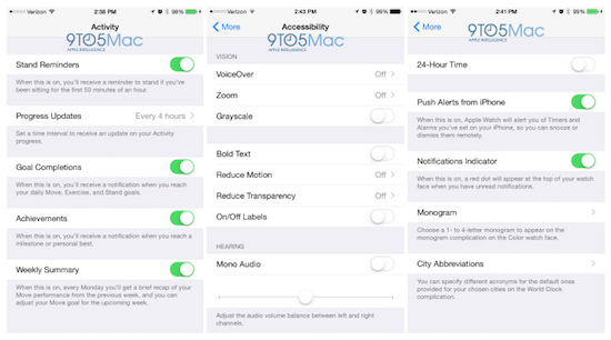 Den Kollegen von 9to5Mac ist zusammen mit dem Entwickler Steven Troughton-Smith mal wieder ein echter Coup gelungen. Nachdem die gestern Abend an Entwickler verteilte vierte Beta von iOS 8.2 bereits einen ersten Hinweis auf eine Apple Watch App zur Konfiguration von Apples Smartwatch gegeben hatte, ist es den Kollegen nun gelungen, an Screenshots aus den Einstellungen der App und Details zu diversen Funktionen zu ergattern. Ein Großteil der Einstellungen für die Apple Watch wird demnach über diese per Bluetooth verbundene App auf dem iPhone vorgenommen und von dort an die Smartwatch übertragen. Unter anderem wird es dabei möglich sein, die Anordnung der Apps auf dem Homescreen der Apple Watch zu organisieren. Hierzu wird dieser innerhalb der App abgebildet, so dass man die Anordnung von dort aus neu gestalten kann. Auch die Anzeige von Benachrichtigungen oder Aktienkurse lassen sich über die App konfigurieren. Zudem kann man offenbar ein Monogramm (typischerweise die eigenen Initialen) auf dem Ziffernblatt einbelnden lassen.