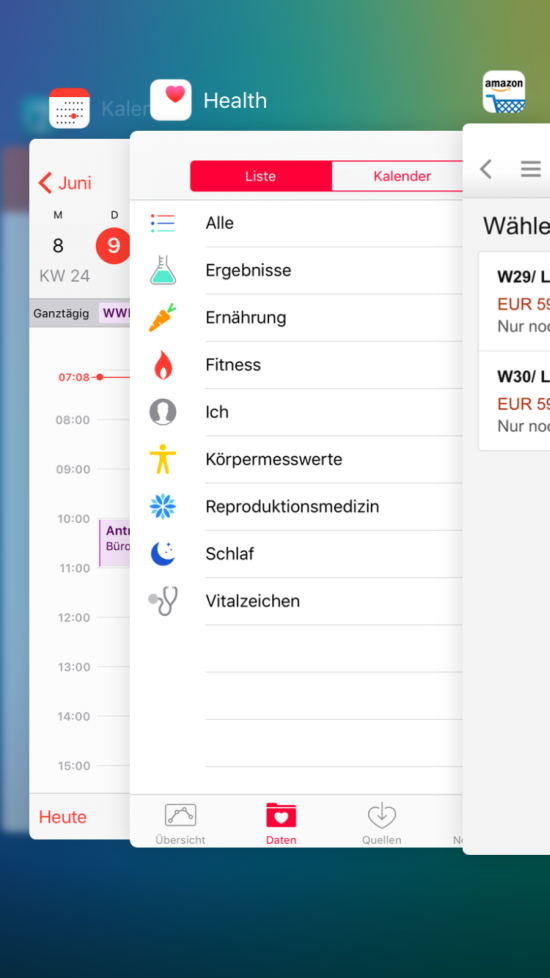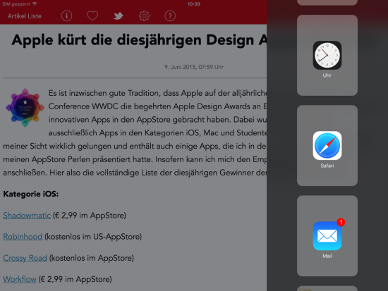 Am meisten profitiert zweifelsfrei das iPad von iOS 9. Hier gibt es unter anderem eine Neuerung bei der Tastatur, die die QuickType-Leiste um zusätzliche Buttons für Schnellzugriffe auf oft genutzte Funktionen ergänzt. Dort findet man unter anderem Schaltflächen für Copy&Paste oder auch die Textformatierung. Legt man zwei Finger auf die Tastatur, wir diese zum Trackpad und man kann deutlich einfacher den Cursor neu positionieren oder Inhalte markieren. Dies funktioniert übrigens auch auf dem iPhone. Exklusiv für das iPad ist allerdings die neue Splitscreen-Option in Sachen Multitasking. Dabei unterscheidet Apple in verschiedene Stufen. Bei "Slide Over" kann man innerhalb jeder App jederzeit vom rechten Displayrand zur Mitte wischen und erhält dann Zugriff auf alle hierfür optimierten Apps, die dann in einer Art iPhone-Ansicht dargestellt werden. Standardmäßig wird hier die zuletzt verwendete App aufgerufen, ein Wisch von oben nach unten fördert jedoch weitere Apps zu Tage.