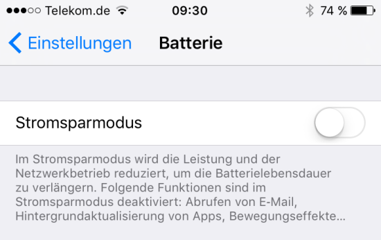 Was hierzu noch fehlt, ist ein entsprechender Button zum Aktivieren des Stromsparmodus im Kontrollzentrum. Dafür werden immerhin nun Informationen zur Akkuladung im Notification Center angezeigt. Zudem kann man den Modus aktivieren, wenn iOS die bekannten Warnungen zur Restlaufzeit bei 20% und 10% anzeigt.