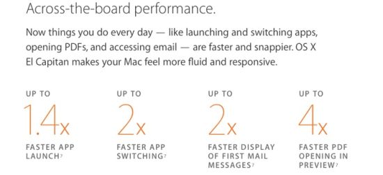 In Sachen Performance baut Apple künftig auch auf dem Mac auf seine im vergangenen Jahr unter iOS eingeführte Metal-Engine, die dafür sorgt, dass Grafiken um bis zu 40% beschleunigt dargestellt werden. Das Starten von Apps soll mit El Capitan sogar um das 1,5-fache, das Wechseln zwischen den Apps um das doppelte beschleunigt werden. Gar 4x schneller soll das Öffnen von PDFs in Vorschau geschehen. Diese Werte müssen sich natürlich erst noch in der Praxis beweisen, in der Regel gibt Apple diese aber recht konservativ an, so dass man sich in der Tat auf mehr Performance freuen darf.