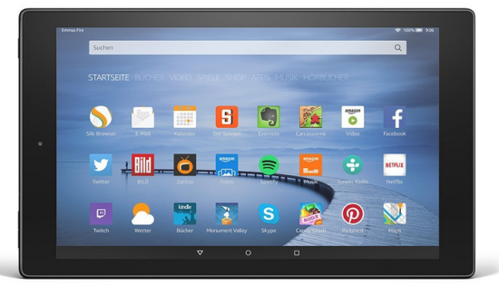 Dritter im Bunde ist das Fire 10, Amazons Entertainment-Tablet mit 10,1"-HD-Display (149 ppi bei 1.280 x 800 Pixeln). Im Inneren werkeln hier wie beim kleineren Bruder oben ein Quad-Core-Prozessor mit bis zu 1,5 GHz und 1 GB RAM. Selbstverständlich gibt es auch hier eine Vorder- und eine Rückseitenkamera. Der Akku hält acht Stunden und neben dem schwarzen Modell gibt es das Fire 10 auch in einer weißen Variante. Die verbauten 16 oder 32 GB Speicherplatz lassen sich auch hier per microSD-Karte mit bis zu 128 GB zusätzlichem Speicherplatz erweitern. Auch mit dem Fire 10 erhält man Zugriff auf "Amazon Underground" und den kostenlosen, uneingeschränkten Speicherplatz in der Cloud. Das neue Fire 10 wird ab dem 30. September ausgeliefert, kann aber bereits zu einem Preis ab € 199,99 über den folgenden Link bei Amazon vorbestellt werden: Fire 10