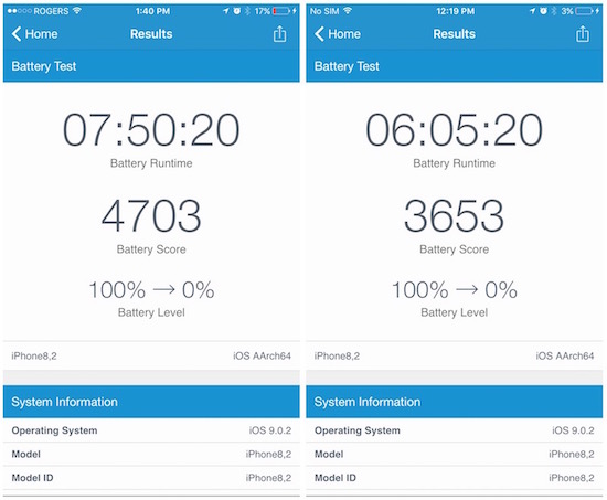 Während die Leistungsfähigkeit der Chips von Samsung und TSMC identisch ist, haben die Kollegen von Engadget nun bei Benchmarktests herausgefunden, dass es Unterschiede im Akkuverbrauch zwischen den A9-Chips gibt. So sollen die Chips von TSMC unter Volllast ein bis zwei Stunden länger durchhalten, als die von Samsung. Selbstverständlich sind diese Aussagen mit Vorsicht zu genießen, gibt es zwischen verschiedenen Geräten und Konfigurationen immer Unterschiede. Dennoch ist der gemessene Unterschied vergleichsweise groß. Ein Reddit-Nutzer hat die Akkulaufzeit von einem iPhone 6s Plus mit jeweils einem Samsung- und einem TSMC-Chip mit dem Geekbench-Test (€ 0,99 im AppStore) verglichen und die unten zu sehenden Ergebnisse gepostet.