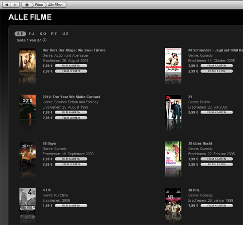 Filme über den iTunes Store anbietet. Seit gestern Abend steht das Angebot nun zur Verfügung und über Nacht ist die Auswahl schon auf eine beträchtliche Zahl angewachsen. Wie bereits aus den USA bekannt, besteht dabei die Möglichkeit eines Kaufs oder des Ausleihens von Filmen. Die Preise für Kauffilme liegen zwischen € 7,99 und € 13,99. Wer einen Film lediglich leihen möchte, kann dies zu Preisen von € 2,99 für ältere Filme und € 3,99 für neuere Filme tun. Ähnlich wie in den USA bietet Apple auch einen wechselnden "99-Cent-Film der Woche", derzeit den Will Smith Film