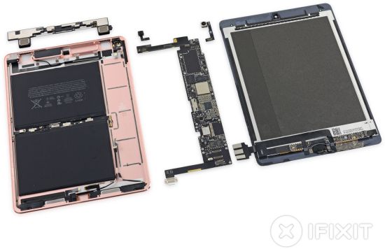 Das iPhone SE war bereits am Freitag an der Reihe, nun folgt das neue 9,7" iPad Pro. Die Reparaturspezialisten von iFixit haben es sich natürlich nicht nehmen lassen, auch dieses neue Apple-Gerät feinsäuberlich in seine Einzelteile zu zerlegen. Dabei bestätigte sich quasi das Erwartete. Beim 9,7" iPad Pro handelt es sich weitgehend um eine Mischung aus iPad Air 2 und dem großen iPad Pro. Der Akku arbeitet mit einer Kapazität von 7.306 mAh, was natürlich deutlich weniger ist als beim großen Bruder (10.307 mAh), aber verbleichbar mit den Werten des iPad Air 2 (7.340 mAh). Bestätigen können die Kollegen die erwartete Arbeitsspeichergröße von 2 GB (hergestellt von Samsung) ebenso, wie eine neuartige Führung der internen Antennenverkabelung, die nun zudem mithilfe von Klebstoffen fixiert ist. Während das große iPad Pro noch ohne die hervorstehende Kamera auskam, muss man hiermit beim 9,7"-Modell wohl oder übel vorlieb nehmen. Als Grund sehen die iFixit-Raparateure die dünnere Gehäuserückseite und die verbesserte Kamera im neuen Modell.