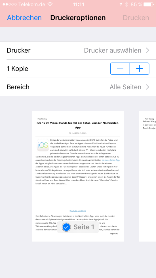 Auf der WWDC-Keynote hat Apple vor allem zehn große und prominente neue Features von iOS 10 in den Vordergrund gestellt. Allerdings findet man immer wieder an jeder kleinen Ecke eine Neuerung, die vielleicht nicht unbedingt bühnentauglich ist, aber dennoch für viele Nutzer einen erheblichen Mehrwert darstellen. Eine dieser kleinen Neuerungen betrifft auch das Drucksystem in iOS. Dieses wird mit Version 10 nun nämlich erstmals in der Lage sein, PDFs aus jedem druckbaren Inhalt erstellen zu können. Hierzu begibt man sich einfach in den Druckdialog des in ein PDF umzuwandelnden Inhalts und führt anschließend auf der Dokumentenvorschau eine Pinch-Geste aus, also dieselbe Geste, die man auch zum Zoomen auf Webseiten oder in Fotos verwendet. Unmittelbar danach steht das Dokument bereits als PDF zur Verfügung, welches dann über das Teilen-Menü an jede App übergeben kann, die PDFs speichert oder weiterverarbeitet.