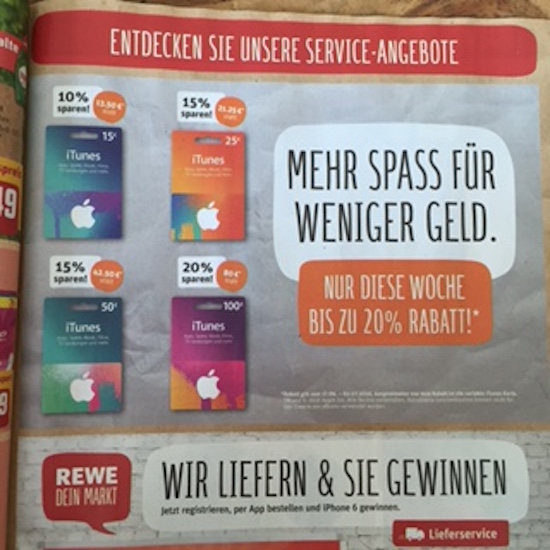 Achtung: Leider kann ich die Hinweise auf die günstigen iTunes-Karten nicht in jedem einzelnen Fall überprüfen. Checkt daher bitte vorher noch einmal ab, ob die jeweilige Filliale den Rabatt auch tatsächlich gewährt!