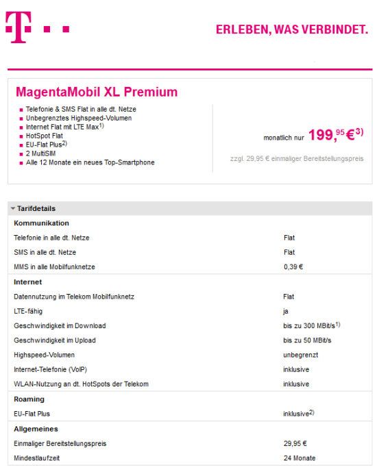 Neben der Tagesoption wird es auch einen neuen Tarif geben, der erstmals eine "echte" sogenannten Daten-Full-Flat beinhaltet, bei der die Surfgeschwindigkeit nicht nach einem bestimmten Inklusivvolumen gedrosselt wird. Dieser Tarif firmiert künftig unter dem Namen MagentaMobil XL Premium und schlägt mit monatlich € 199,95 zu Buche.