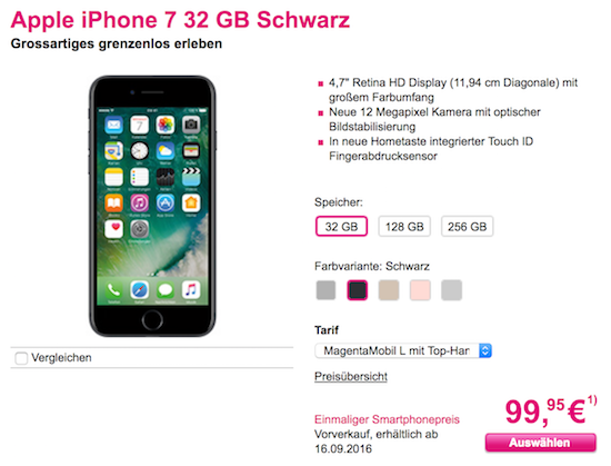 Wie schon in den vergangenen Jahren, ist es auch dieses Jahr wieder die Telekom, die ein bisschen früher mit den Vorbestellungen für die neuen iPhones dran ist als Apple selbst. Offiziell nimmt Apple die Bestellungen ab 09:01 Uhr entgegen. Die Telekom hat hiermit jedoch inzwischen bereits begonnen. Hier erhält man das Gerät bei Abschluss eines zugehörigen Mobilfunkvertrags entsprechend im Preis reduziert. So erhält man beispielsweise das iPhone 7 mit 32 GB in schwarz bei Abschluss eines MagentaMobil L Laufzeitvertrags für nur € 99,-.