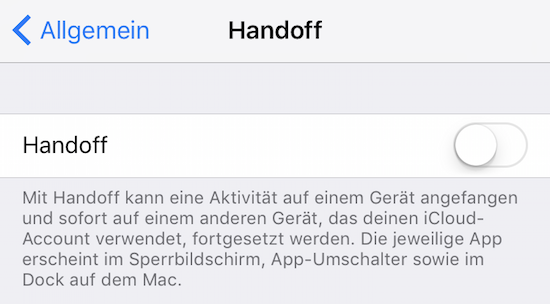 Was hat dies aber nun mit Handoff zu tun? Nun, die allgemeine Zwischenablage ist Teil von Handoff. Unglücklich ist hier allerdings, dass man sie nicht einzeln deaktivieren kann. Schaut man in die Einstellungen des iPhone findet man zum Punkt Handoff hier genau einen Schalter: Ein oder Aus. Ein Finetuning für die einzelnen Unterfunktionen sucht man hingegen vergabens. Da mir das angesprochene Szenario mit der überschriebenen Zwischenablage auf dem Mac nun schon das eine oder andere Mal passiert ist, habe ich mich folglich dazu entschieden, Handoff komplett zu deaktivieren. Das Negative überwog für mich letztlich das Positive.