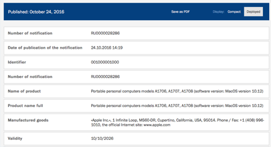 Unterdessen sind in einer russischen Datenbank für Markenanmeldungen drei bislang unveröffentlichte Macs unter macOS Sierra aufgetaucht, von denen zwei vermutlich die beiden neuen MacBook Pro sein dürften. Aus derselben Quelle stammten bereits die korrekten Leaks zum iPhone 7, der Apple Watch Series 1 und der Apple Watch Series 2, die ca. eine Woche vor dem September-Event auftauchten.